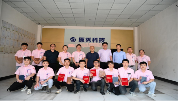 6月6日上午,我司與重慶城市科技學(xué)院的校企合作協(xié)同育人項目-第一期原秀科技“聯(lián)合培養(yǎng)班”結(jié)業(yè)典禮在公司內(nèi)部順利舉行,為城科院實習(xí)生在公司為期六個月的實踐生活,畫上了一個完美的句號。重慶城市科技學(xué)院陳進(jìn)院長,潘銀松常務(wù)副院長、李曉飛黨總支副書記,原秀科技莊靜雄副總經(jīng)理、鄧瑞華副總經(jīng)理、彭世花經(jīng)理等一行11位領(lǐng)導(dǎo)出席此儀式,“聯(lián)合培養(yǎng)班”全體學(xué)員、重慶城市科技學(xué)院大三學(xué)生20余人參加了儀式。